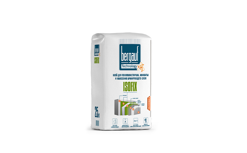 Клей для пенополистирола, минваты и нанесения армирующего слоя Bergauf Isofix используется для следующих типов основания: кирпичная кладка, бетон, железобетон, ячеистый бетон, цементная и цементно-известковая штукатурка, гипсовая штукатурка. Для наружных и внутренних работ с нормальной и повышенной влажностью. Подходит для минераловатных плит, пенополистирола.